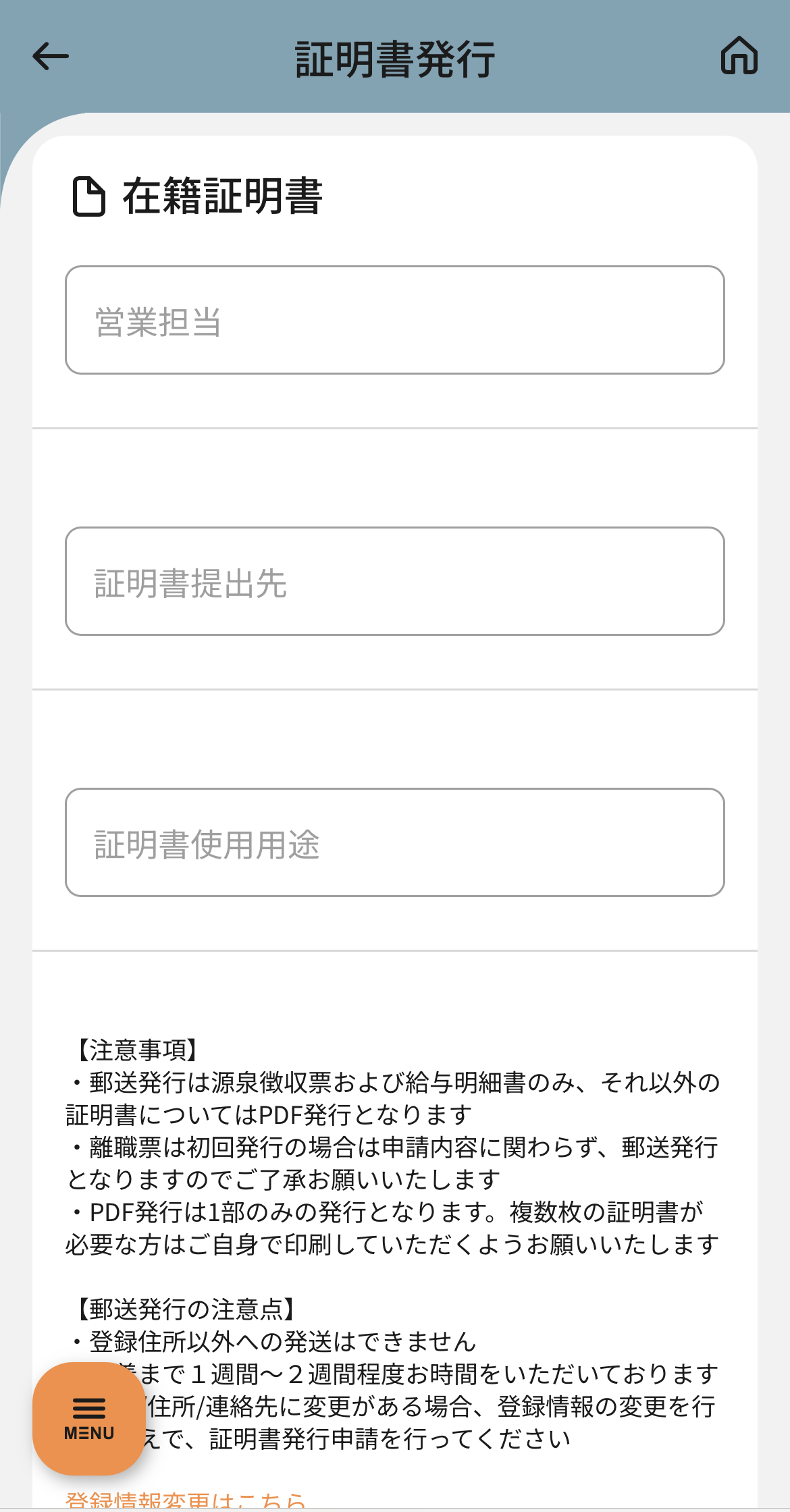 TOP画面の「申請する」もしくはその他>申請する>証明書発行をクリックする。